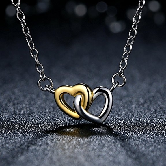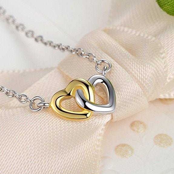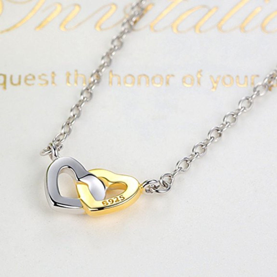 The design showcases two interlocked hearts — one in classic silver, the other in golden shine — representing unity and affection.